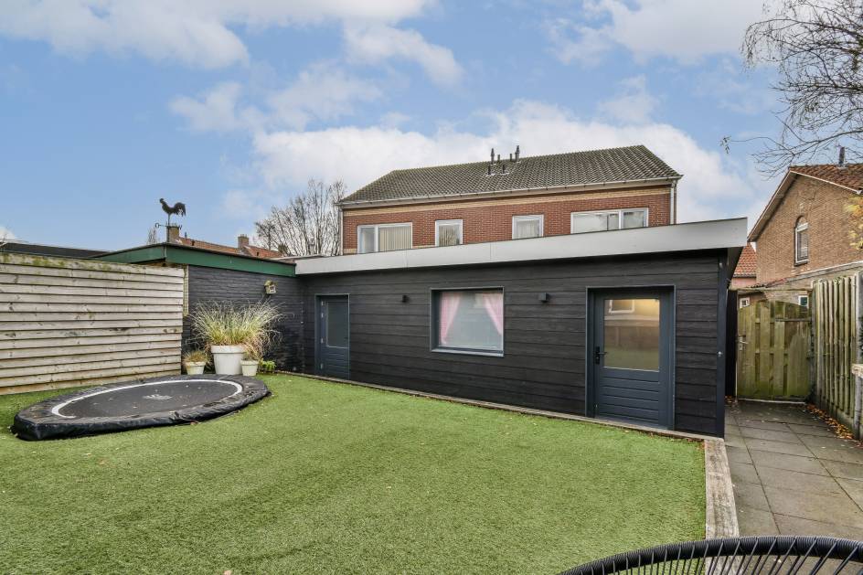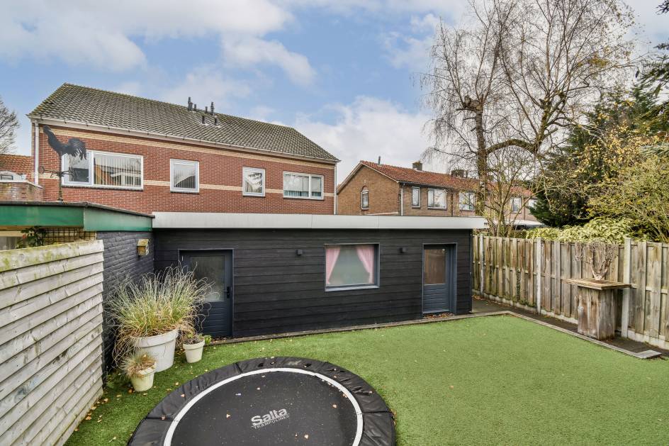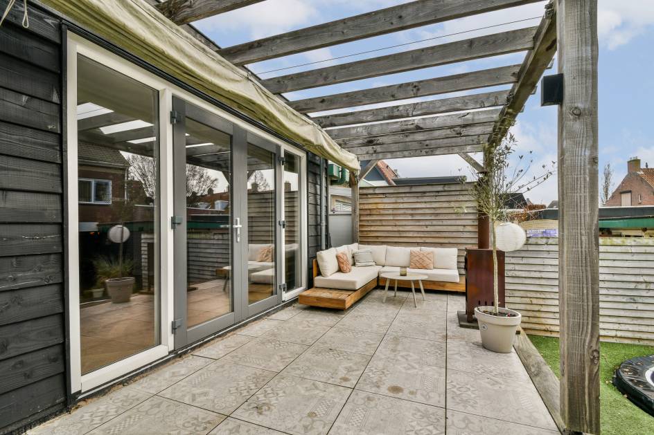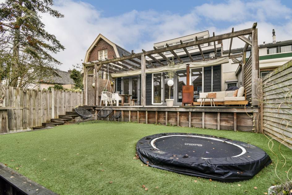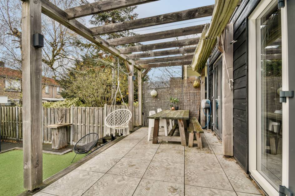 Het onderhoudsvriendelijke kunstgras en de fraaie overkapping (pergola) creëren een fijne en sfeervolle buitenruimte.