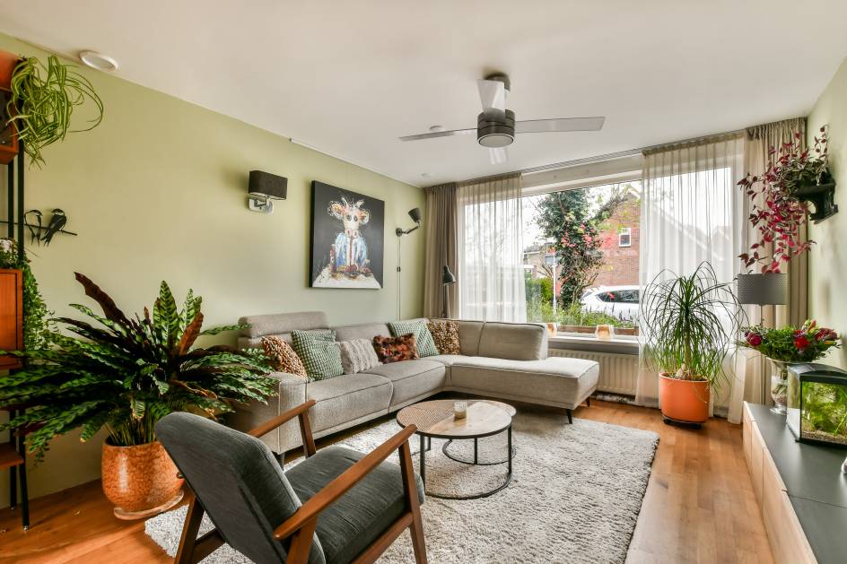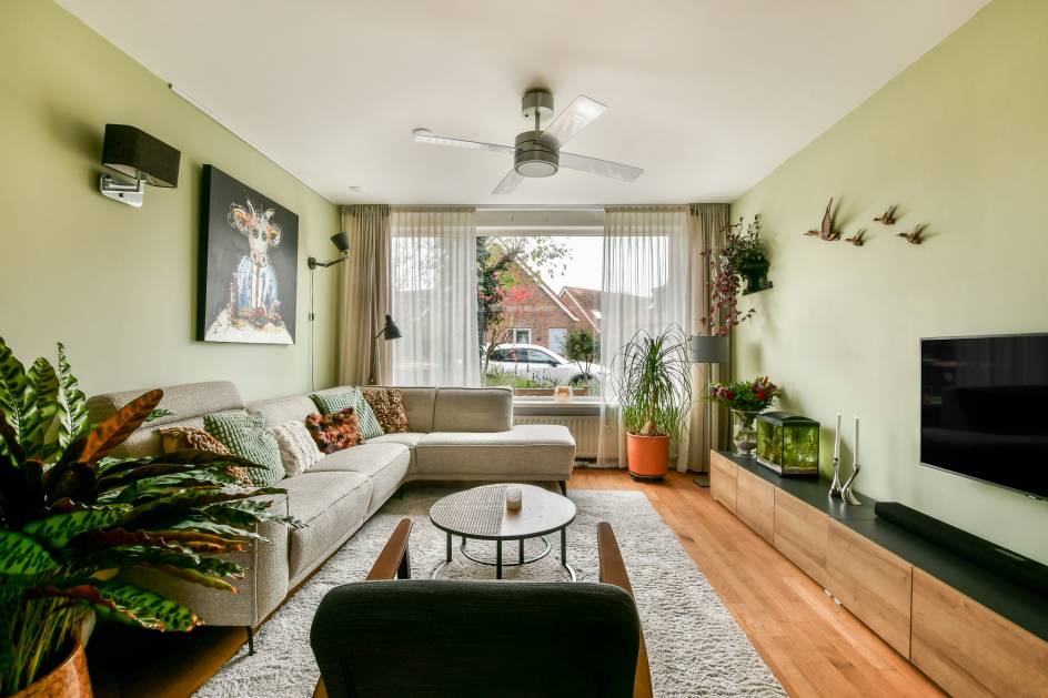De woonkamer is licht en prettig ingedeeld en voorzien van kunststof kozijnen met HR++ glas en een zonnescherm aan de voorzijde.