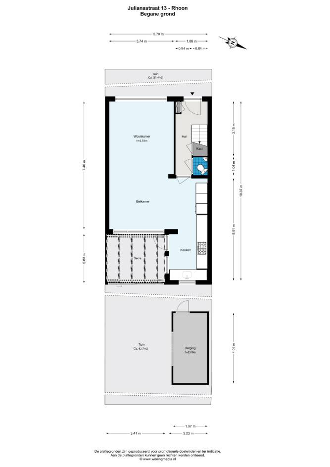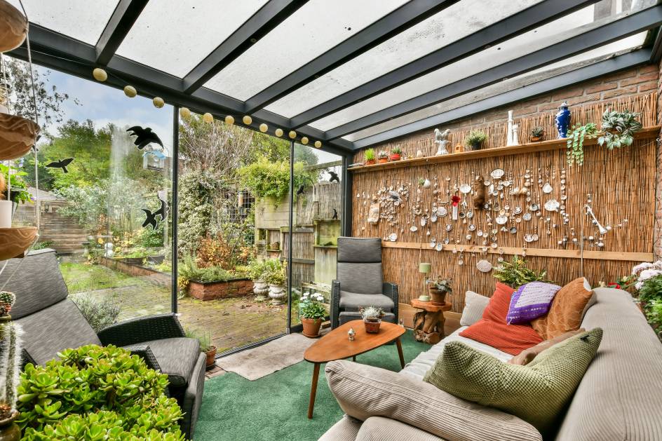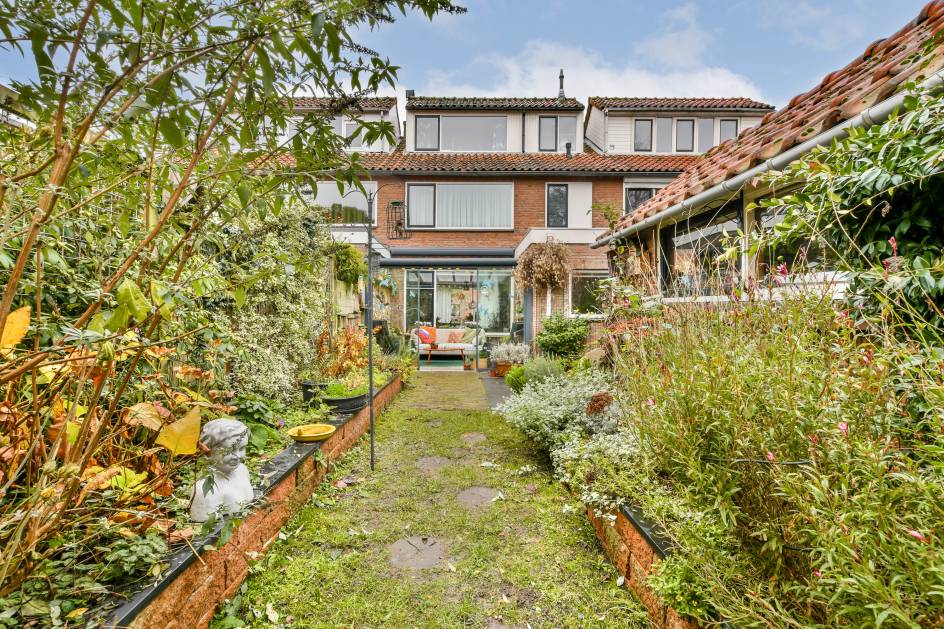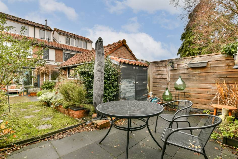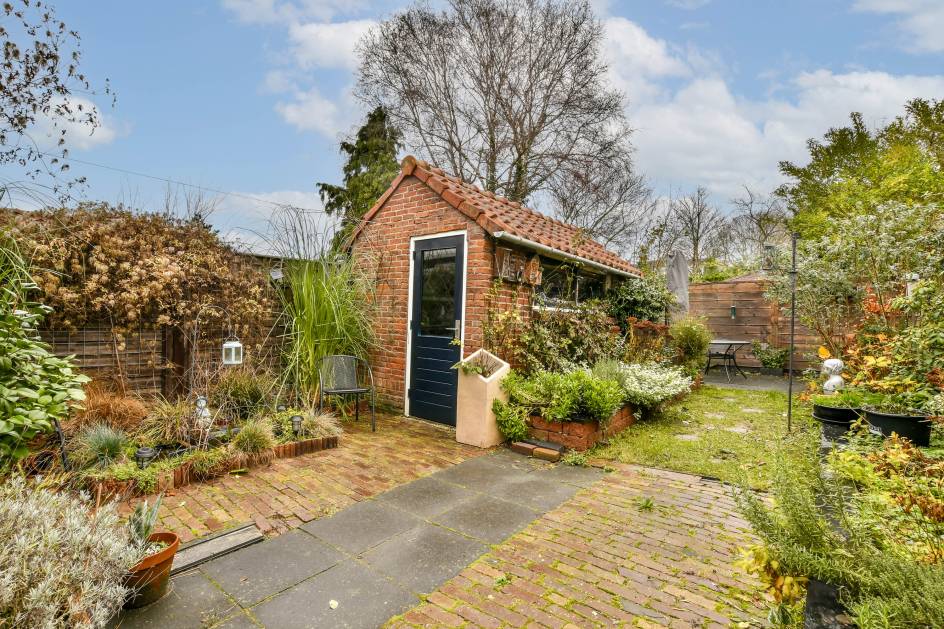Buiten: De woning beschikt over een verzorgde voortuin en een diepe achtertuin met achterom. De achtertuin, gelegen op het oosten, is voorzien van een ruime serre (2021) met zonscreen, heater en geïntegreerde verlichting. Een functioneel schuurtje voor fietsen en tuinmateriaal