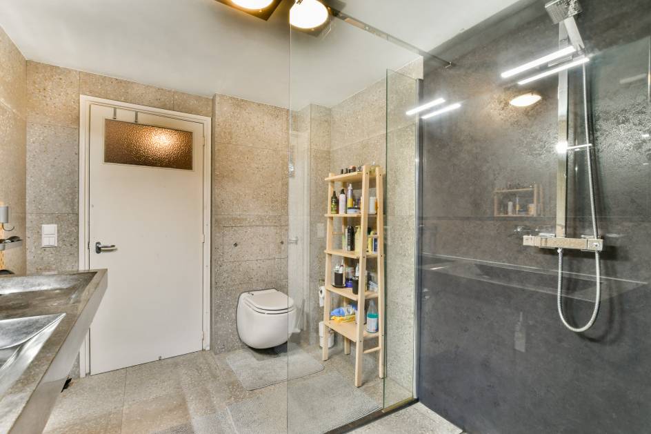 De moderne, ruime badkamer beschikt over een dubbele wastafel, een royale inloopdouche en een tweede toilet. Aan de voorzijde vindt u bovendien een praktische wasruimte met wastafel en aansluitingen voor wasmachine en droger (eveneens met kunststof kozijnen en HR++ glas).