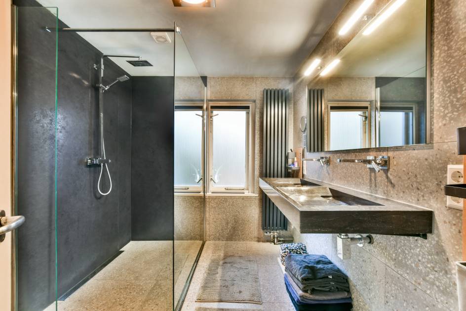 • Ruime badkamer met inloopdouche, dubbele wastafel en toilet;