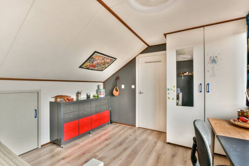 2e verdieping: Op de tweede verdieping treft u de overloop met de cv-ketelopstelling (Remeha, 2023). De slaapkamer aan de achterzijde, uitgevoerd met dakkapel, houten kozijnen en dubbel glas, beschikt over handige opbergschotten.