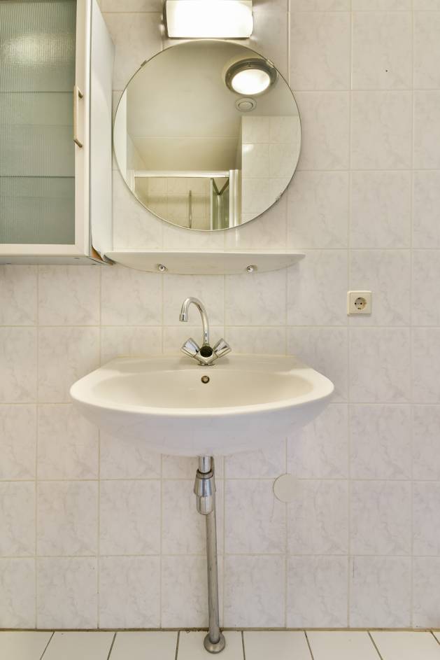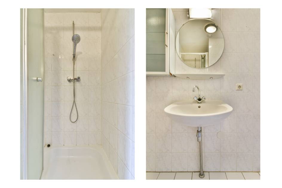 De badkamer is volledig betegeld en beschikt over een douchecabine en een wastafelmeubel.