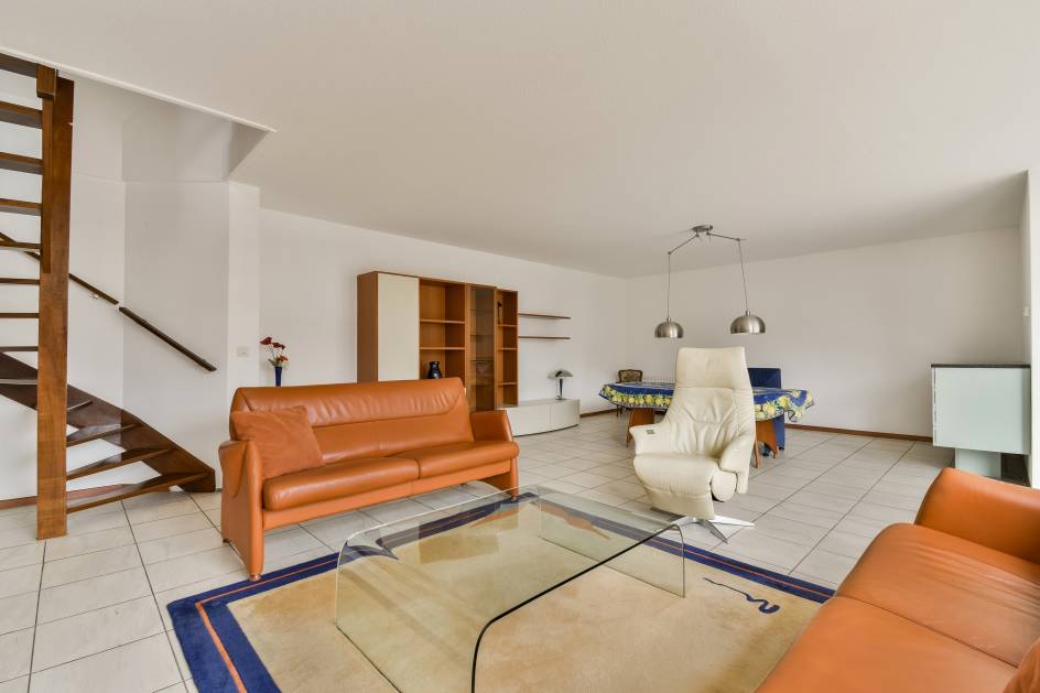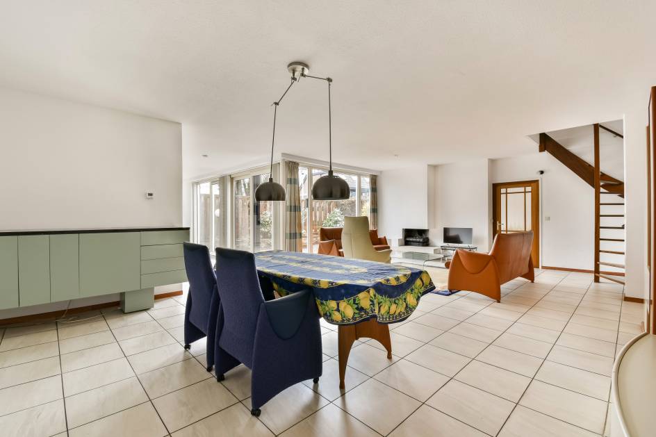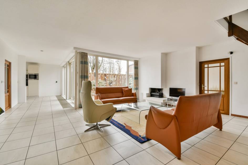 De woonkamer is ruim en licht dankzij de grote raampartijen en beschikt over een sfeervolle open haard. Via de schuifpui is er directe toegang tot de tuin. De woonkamer staat in open verbinding met de keuken.