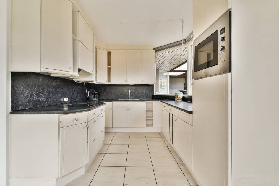 De open keuken is praktisch ingericht en voorzien van diverse inbouwapparatuur, waaronder een combi-oven/magnetron, koel-vriescombinatie en een inductiekookplaat.