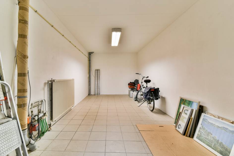 Aan de voorzijde van de woning bevindt zich een eigen oprit met parkeergelegenheid voor een auto en een garage.